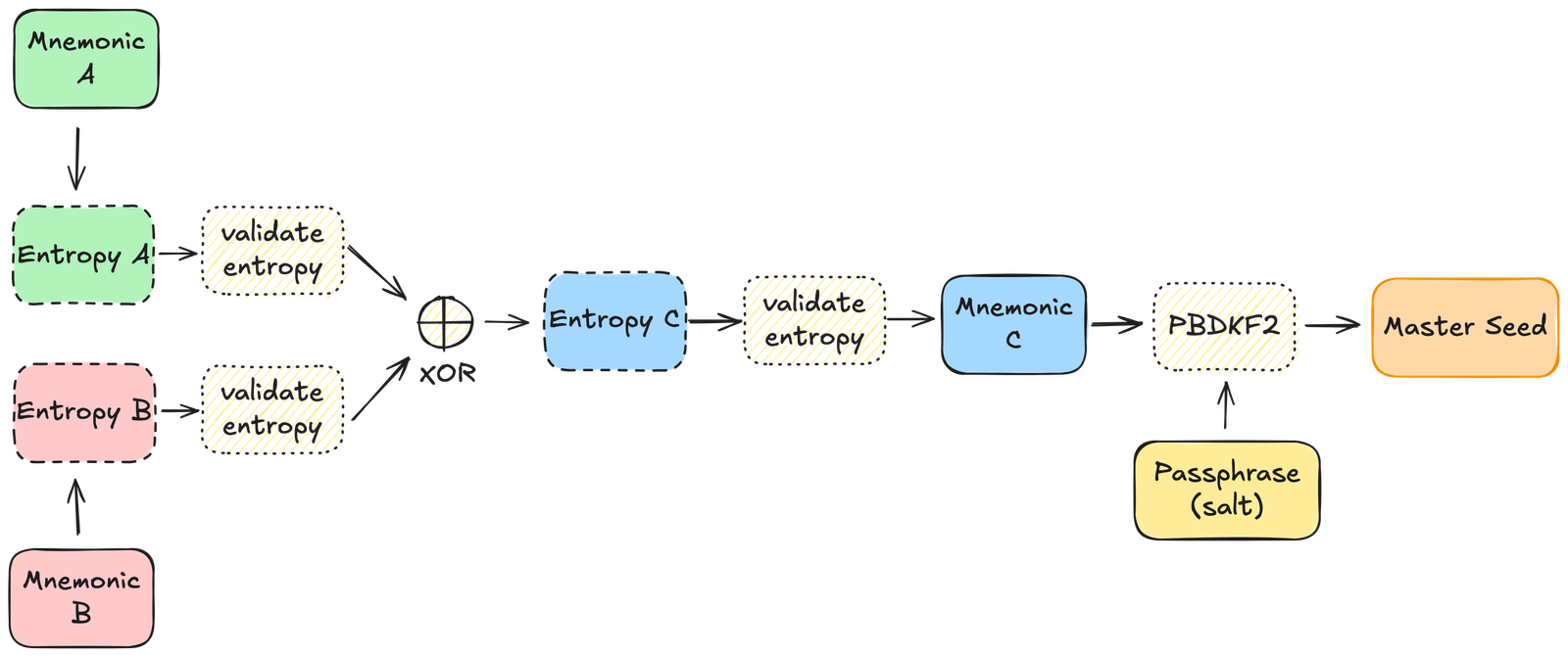 - Obtain two different mnemonics (A and B) and extract their entropy bytes.