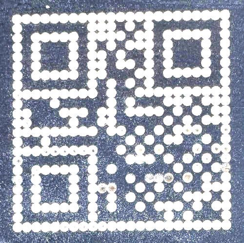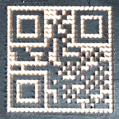 A 50x50mm QR carved into black-painted wood with 2mm drill-bit (inverted for white):