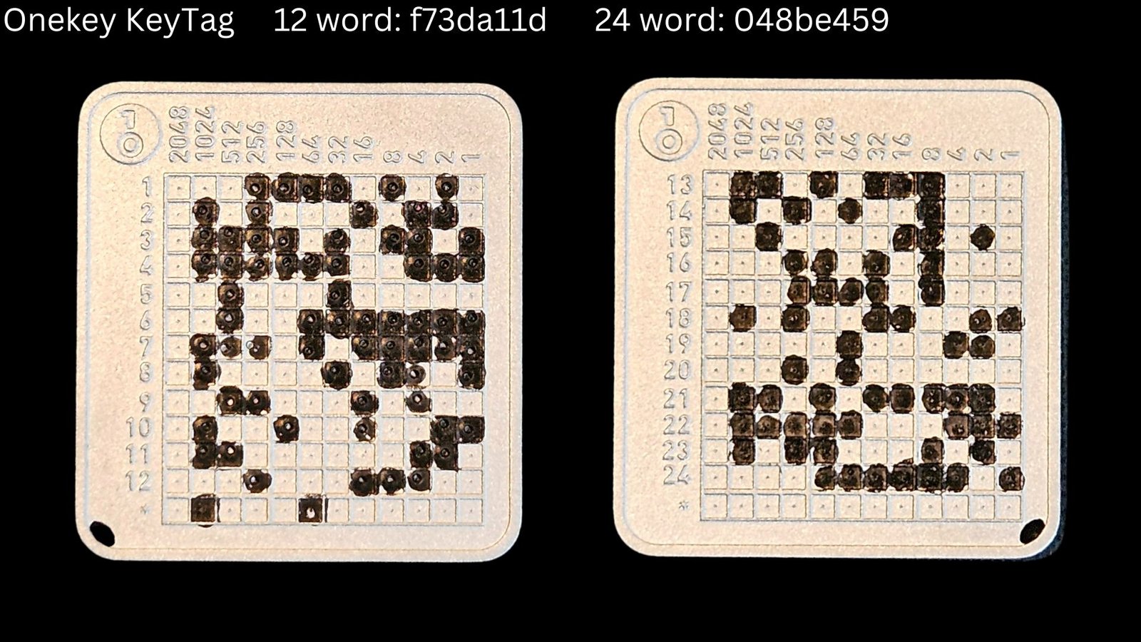 The examples below have been created so that you can test the workflow for scanning both 12 and 24 word mnemonics (the left plate only for a 12 word mnemonic and both plates for 24). The resulting fingerprint from an successful scan is also incldued in the image.