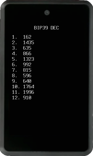 Display the BIP39 mnemonic word numbers (1-2048) in decimal, hex, or octal format.