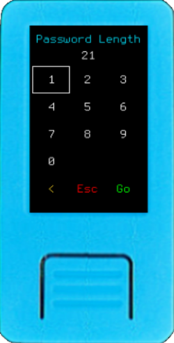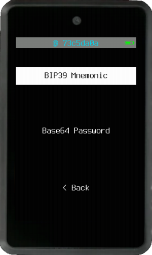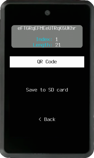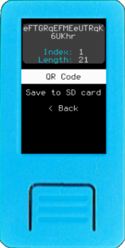 To create a Base64 password, which can be used in a variety of logins, from email to social media accounts, choose an index and then a length of at least 20 characters. The resulting password will be displayed on the screen and can also be exported to an SD Card or as a QR code.