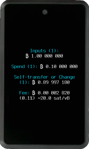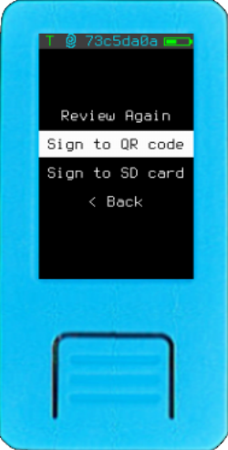 Review: Preview the PSBT again - including inputs, outputs (send, self-transfer, or change), and fee.Sign to QR code: Display the signed PSBT as an animated QR code, ready to be scanned by your coordinator wallet.Sign to SD card: Save the signed PSBT file to your SD card for later import into your coordinator wallet.