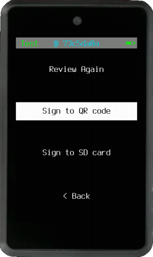 If you confirm, a signature will be generated, and you will see a base64-encoded version of it. You can then choose to export it as a QR code or save it to an SD card. If a thermal printer is attached, you can also print the QR code.
