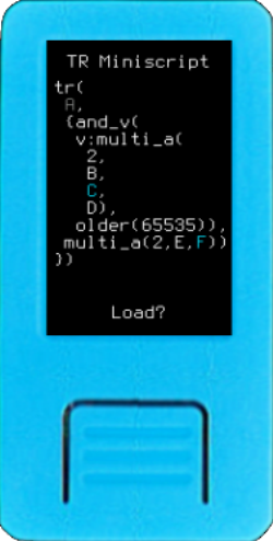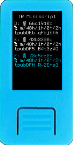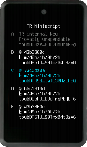 Miniscript Descriptors present an indented view of the miniscript after the keys. When Taproot is used, Krux checks if the internal key is "provably unspendable", meaning funds can only be moved via Tap tree scripts, in which case the internal key is displayed in a disabled color.