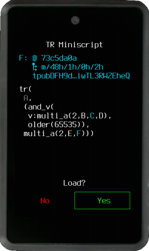 When you select the Wallet Descriptor option for the first time, you will be prompted to load via QR code or SD card. After loading, a preview of the descriptor attributes will be displayed for confirmation. We shown each key’s fingerprint, derivation path, and abbreviated XPUB highlighted with a different color.